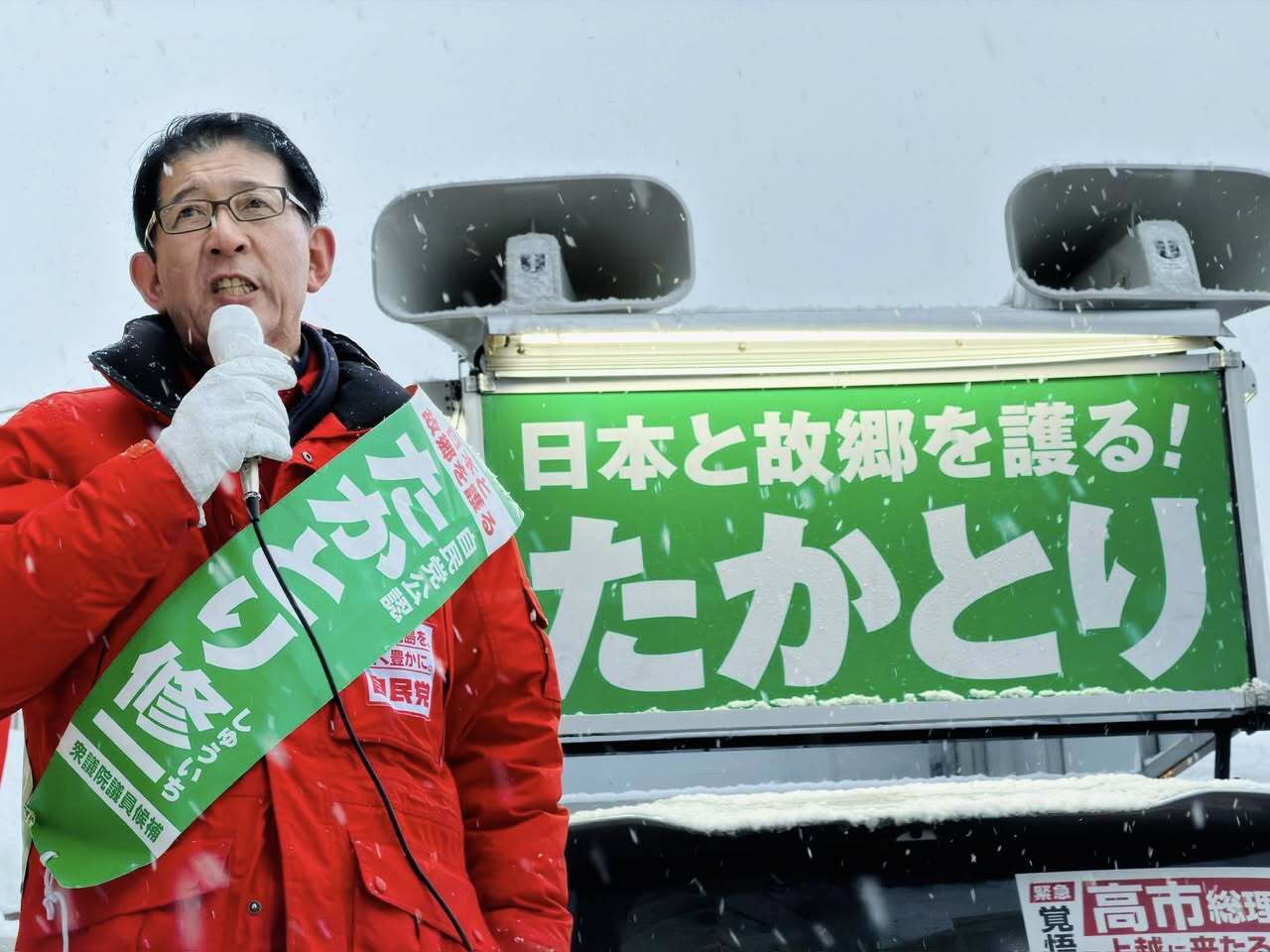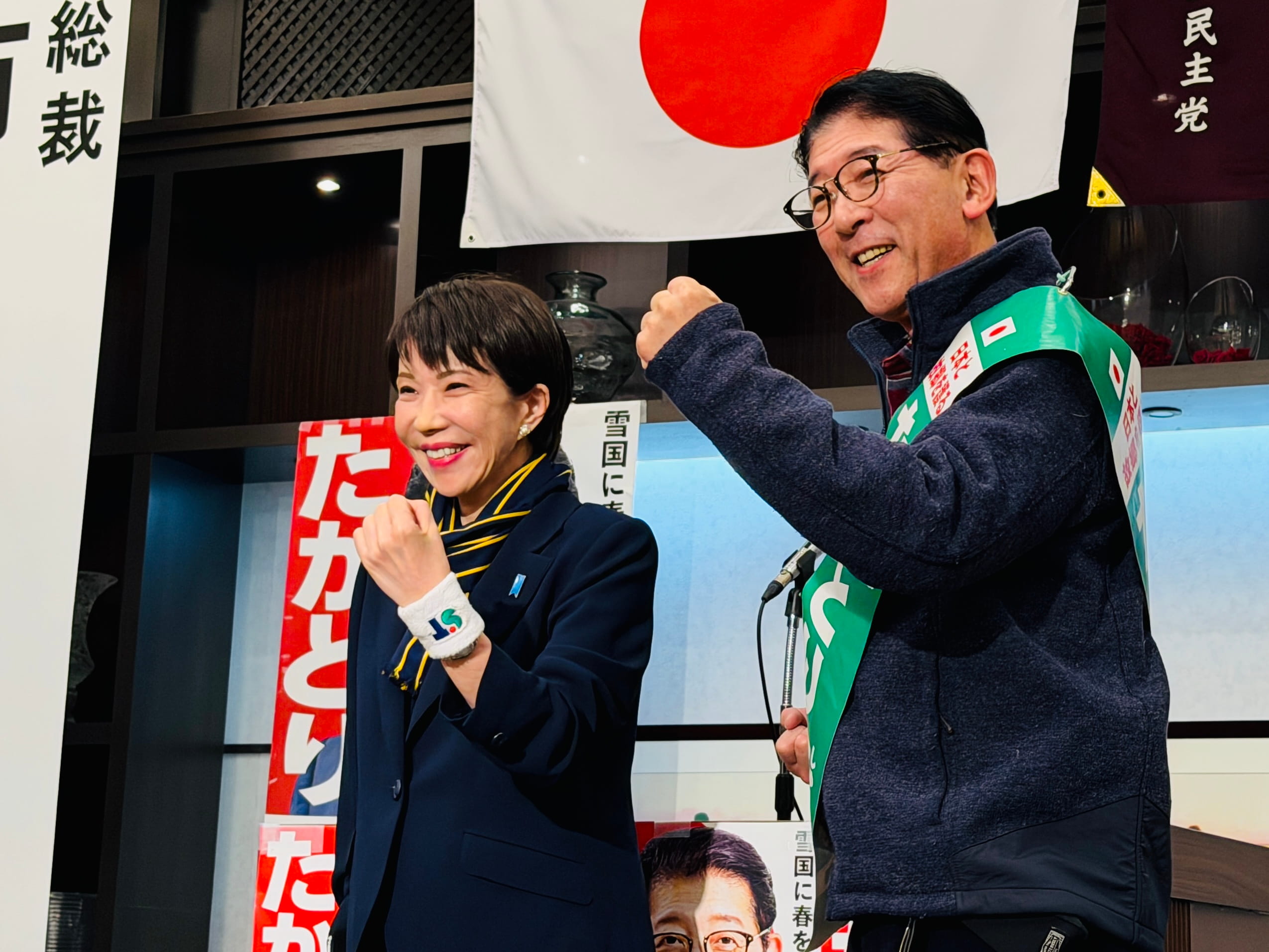 私は今、経済再生へ「責任ある積極財政」を掲げ、信を問う決断をしました。この戦いに髙鳥さんの力は不可欠です。どうか皆様の力で、もう一度、髙鳥修一さんを私の元へ送り出し、共に明日の日本を創らせてください!